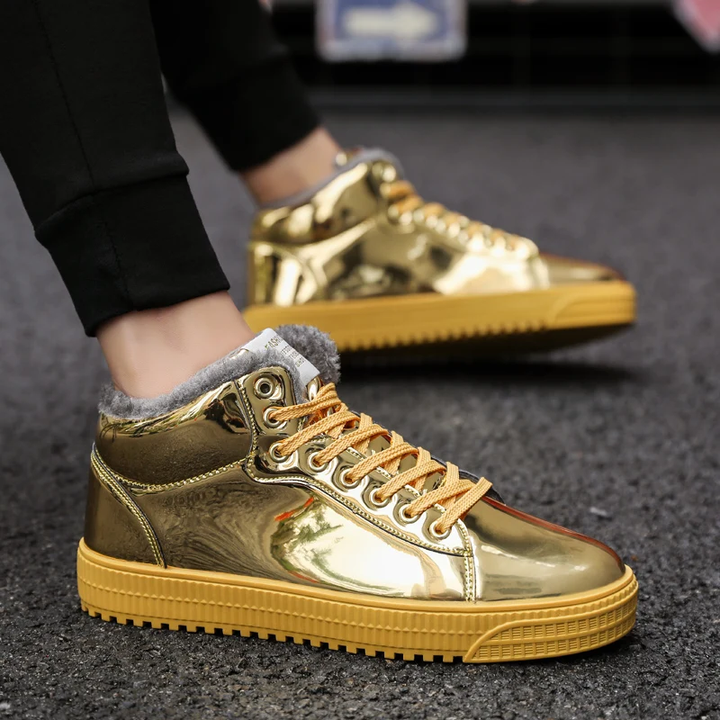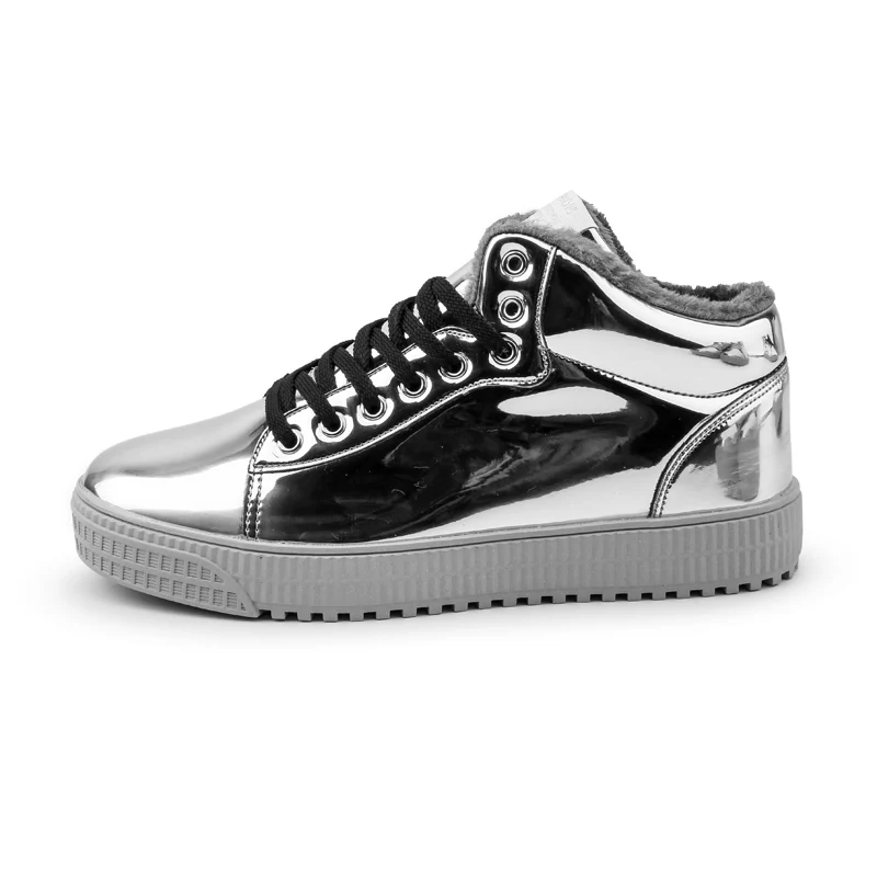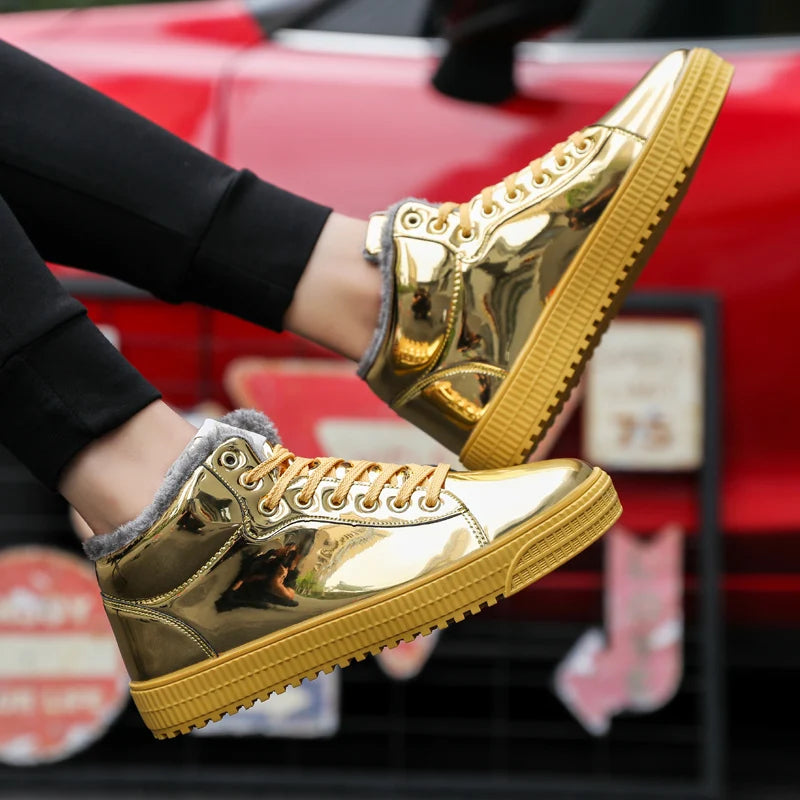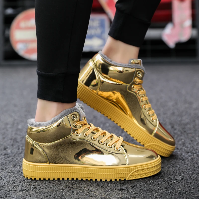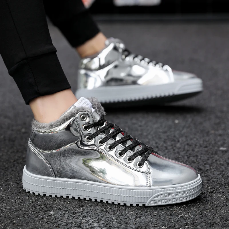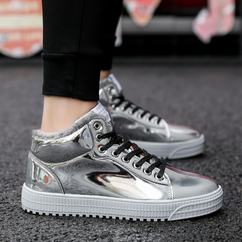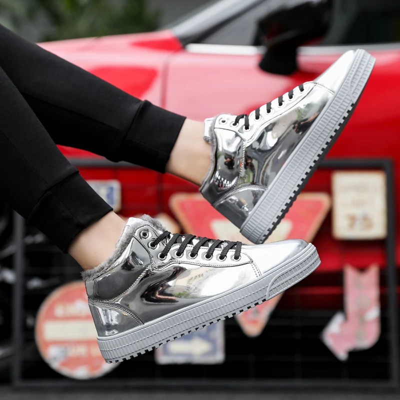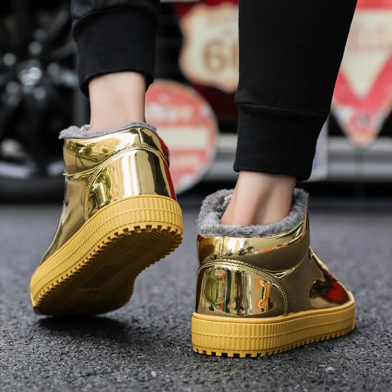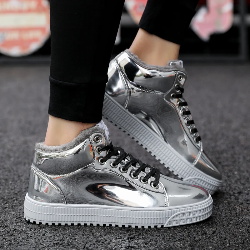 Warm Men Shoes Patent Leather Sneakers High Tops Gold Silver Hip Hop Boots Plush Winter Shoes Fashion Shoes Flats Size 47
