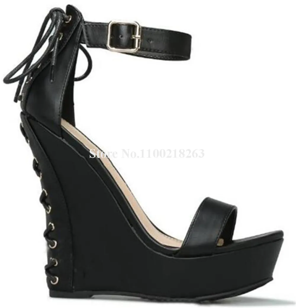 Women Summer Fashion High Platform Wedge Sandals Black Red Blue Open Toe Back Lace-up Ankle Strap High Heel Wedges Big Size